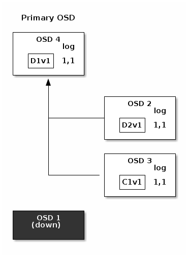 But accidents happen. If OSD 1 goes down while D2v2 is still in flight, the object’s version 2 is partially written: OSD 3 has one chunk but that is not enough to recover. It lost two chunks: D1v2 and D2v2 and the erasure coding parameters K = 2, M = 1 require that at least two chunks are available to rebuild the third. OSD 4 becomes the new primary and finds that the last_complete log entry (i.e., all objects before this entry were known to be available on all OSDs in the previous acting set ) is 1,1 and that will be the head of the new authoritative log.