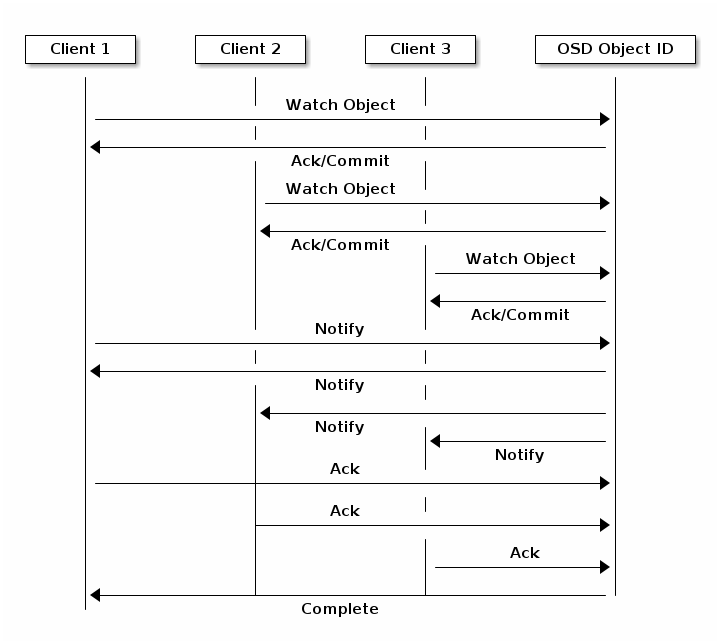 A client can register a persistent interest with an object and keep a session to the primary OSD open. The client can send a notification message and a payload to all watchers and receive notification when the watchers receive the notification. This enables a client to use any object as a synchronization/communication channel.