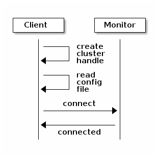 Once you create the handle, you can read a Ceph configuration file to configure the handle. You can also pass arguments to your app and parse them with the function for parsing command line arguments (e.g., rados_conf_parse_argv()), or parse Ceph environment variables (e.g., rados_conf_parse_env()). Some wrappers may not implement convenience methods, so you may need to implement these capabilities. The following diagram provides a high-level flow for the initial connection.